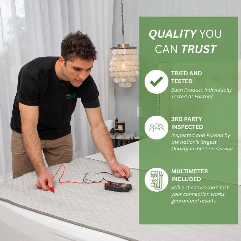 Unlike most grounding brands using only a 50kΩ resistor, our 120kΩ resistor cable offers a safer connection between your power outlet and mat. Every Grounding Mat is individually tested before shipping, and with our Complete Grounding Kit™ - which includes a multimeter - you’ll be empowered to verify its effectiveness yourself. No guesswork. No compromise. Just safer, proven grounding.